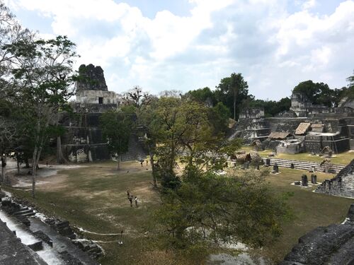 ティカル遺跡のクライマックス!、グランプラザの広場からです。 グランプラザ グランプラザは東西に、1,2号神殿、北に、ノースアクロポリス、南には、セントラルアクロポリスの建造物で構成されています。 写真は、向かって右が1号神殿、中央はノースアク…