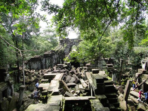 シェムリアップの街から東に1時間半、修復が施されておらず、放置された巨大遺跡、「ベンメリア」南門からです。 概要、シェムリアップからの移動、参道までは、こちらの日記をご覧ください。 南門 参道をしばらく歩くと、南門が見えてきました。崩れていて…